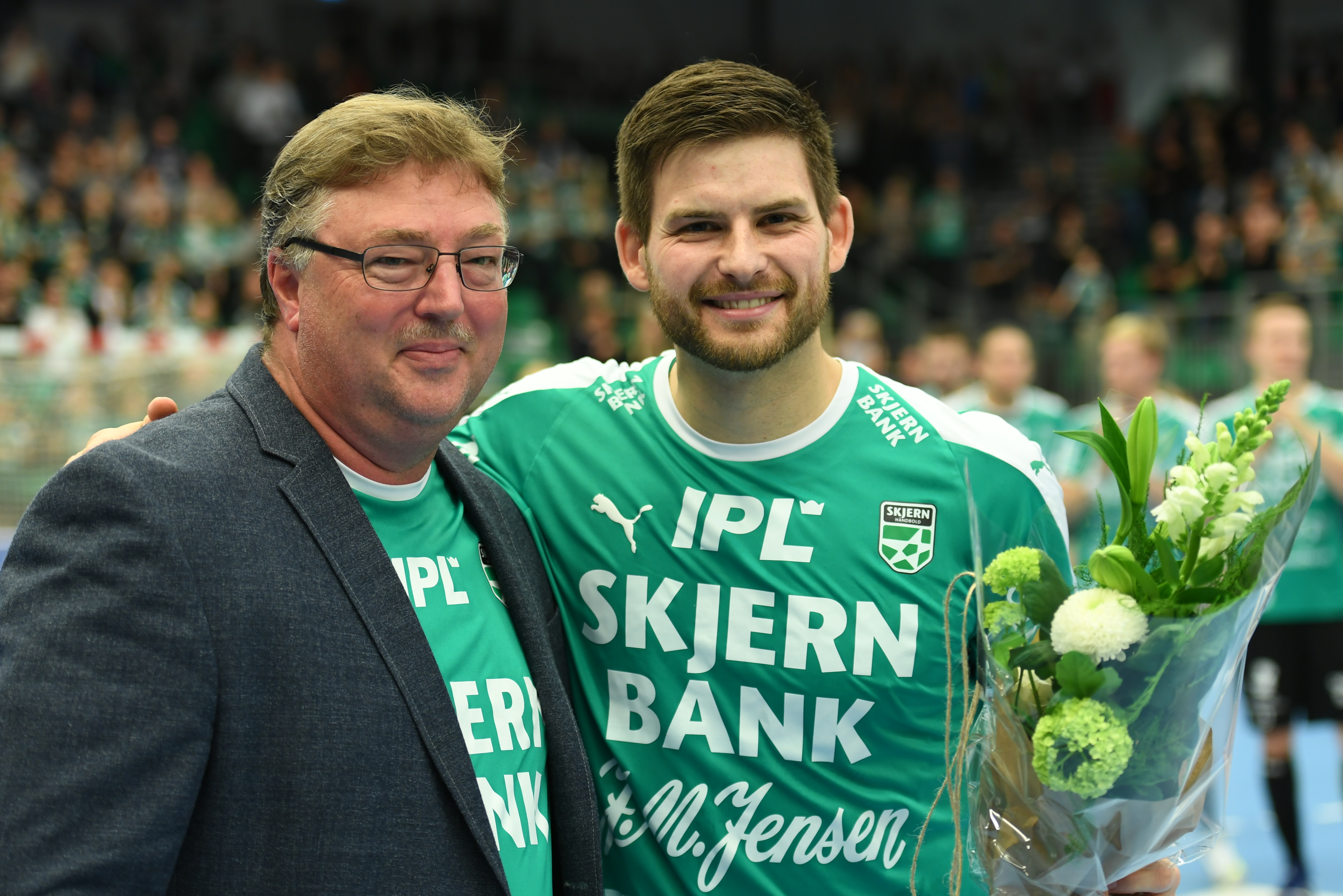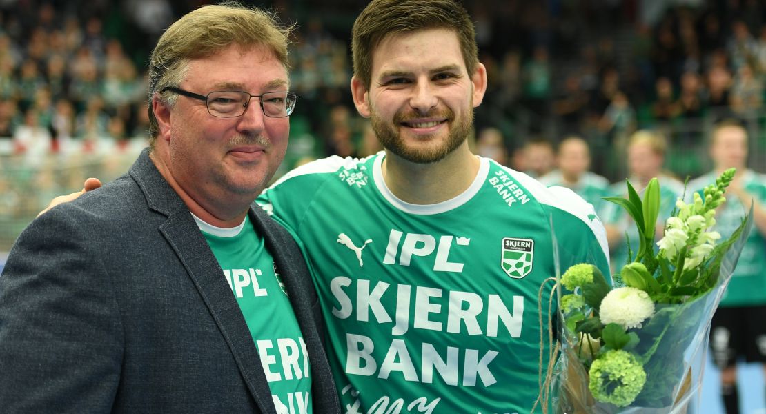 Skjern-bagspilleren fik overrakt blomster af Erik Jensen fra islændingens personlige sponsor, JM Jensen, før gårsdagens kamp. Foto: Steffen Bloch.