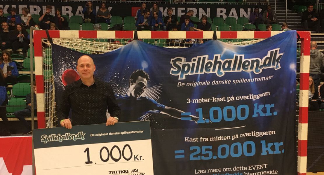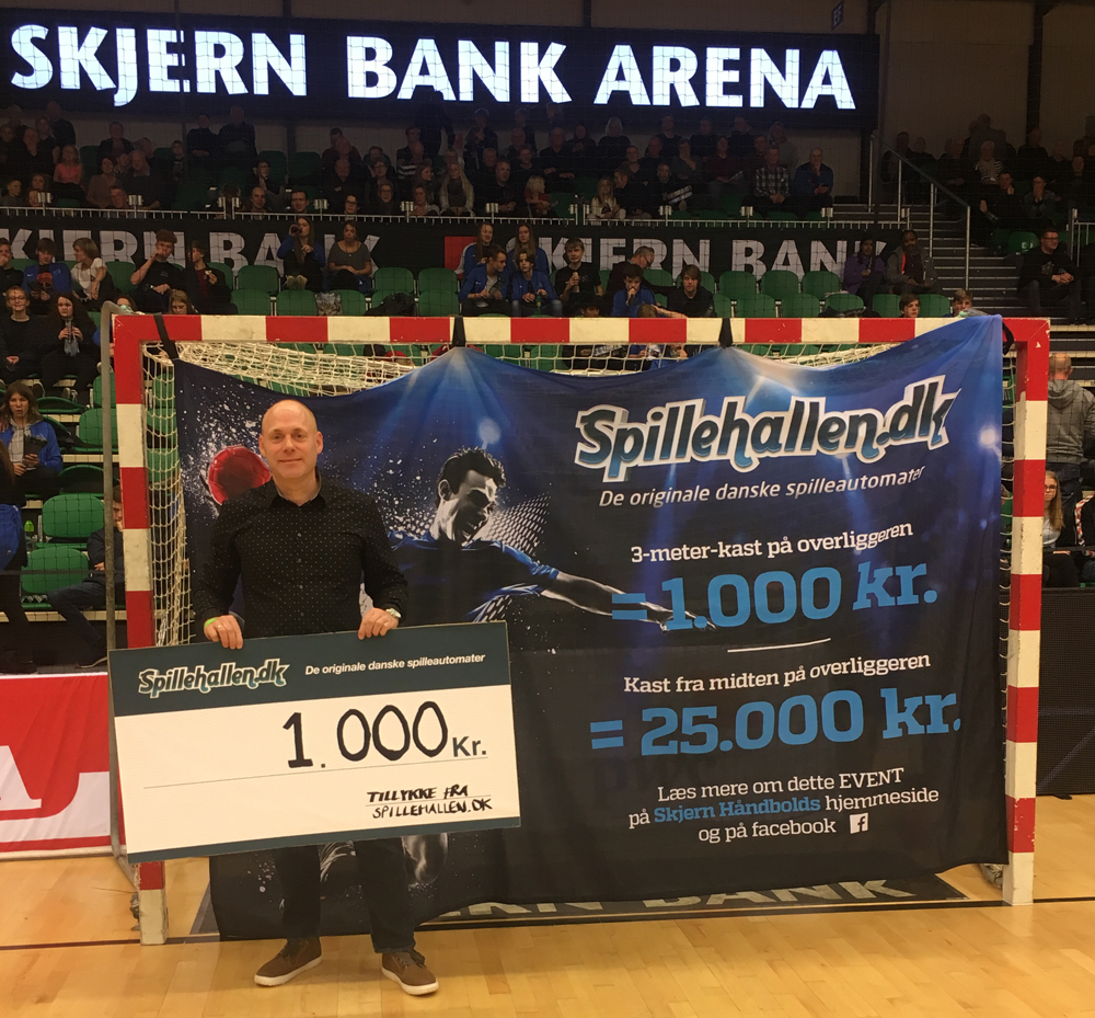 Spillehallen.dk var mandag aften i Skjern Bank Arena, hvor en heldig kunde blev udtrukket til pauseaktiviteten "Lav dit livs kast". Alex K. Madsen fik muligheden for at kaste sig til hele 25.000,-.