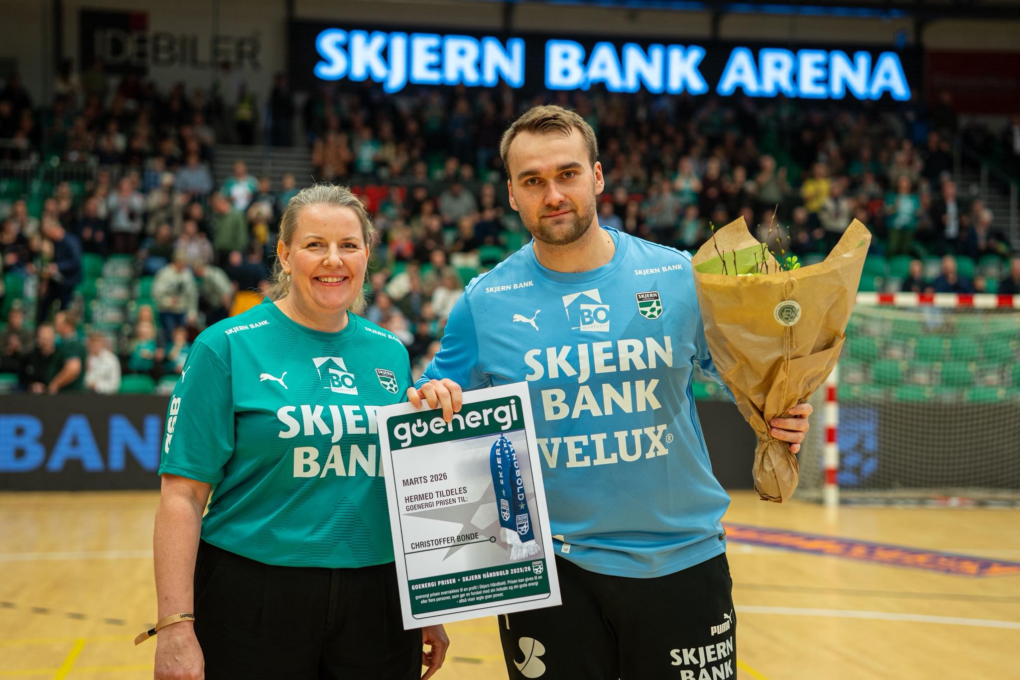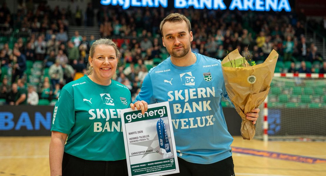 Det blev markeret inden fredagens hjemmekamp, hvor Skjern-keeperen fik overrakt go´energi-prisen af Tina Lund fra RAH.