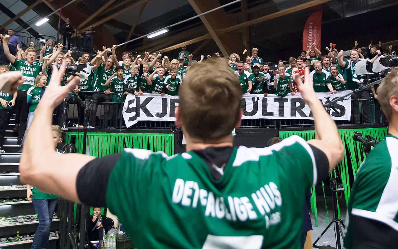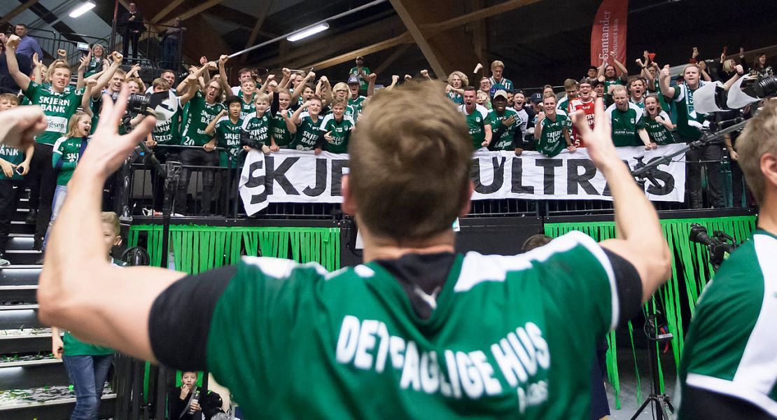 Anfører Thomas Klitgaard i jubel med Skjern Ultras efter pokalguldet var en kendsgerning sidste søndag.