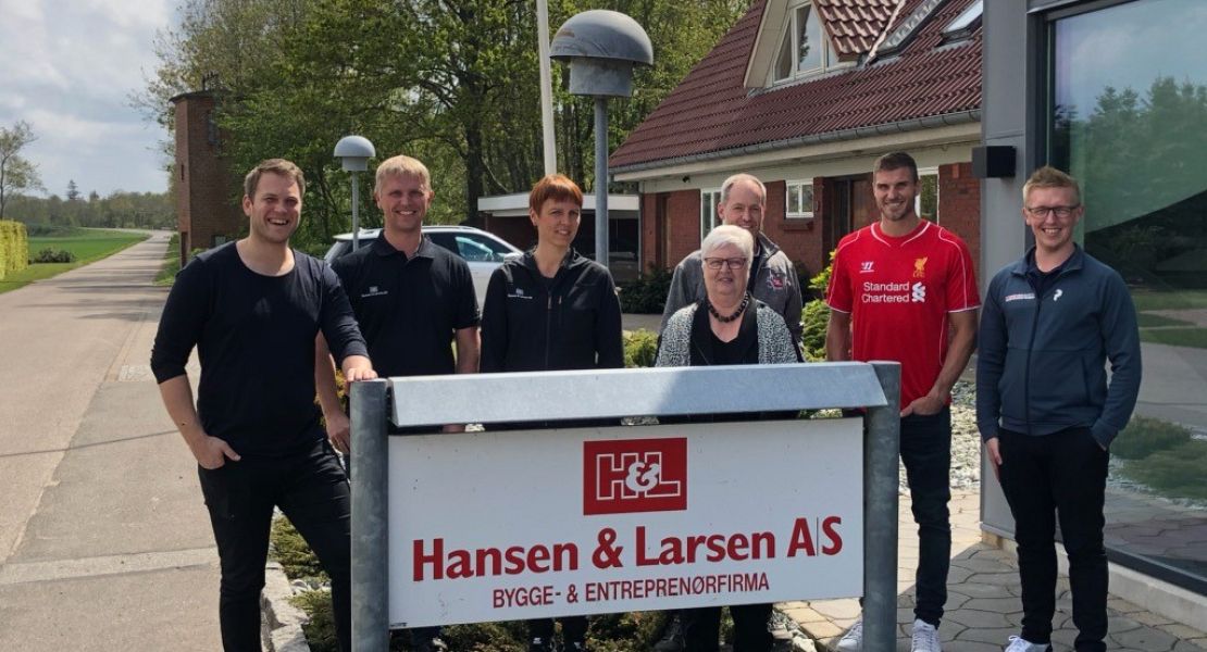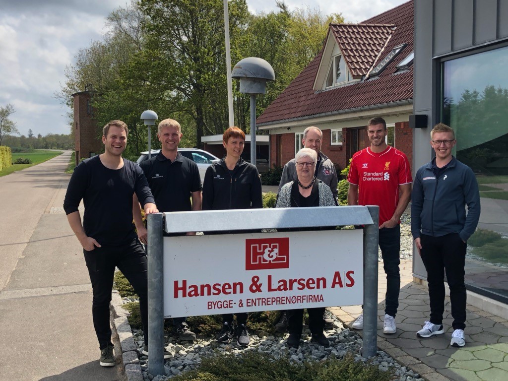 På besøg hos Hansen & Larsen A/S i Dejberg, hvor firmaet hører hjemme og beskæftiger ca. 90 medarbejdere i byggebranchen. Fra venstre er det Christoffer Cichosz, og derefter fra Hansen & Larsen: Karsten, Dorte, Meta, Brian og Skjern Håndbolds anfører Bjarte Myrhol og Lars Larsen. Som inkarneret LFC fan var der god mulighed for Bjarte for at lufte den røde trøje eftersom Liverpool aftenen forinden kvalificerede sig til Champions League finalen.