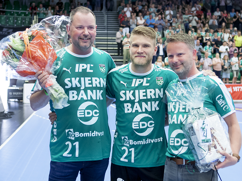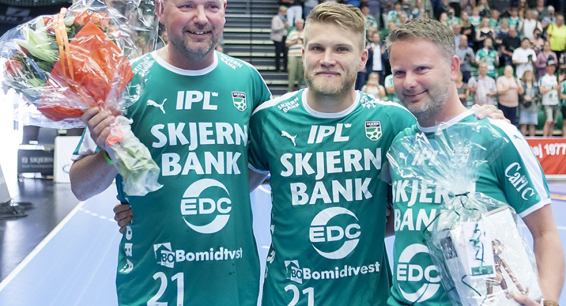 René Rasmussen og Bjarke Christensen blev hyldet i Skjern Bank Arena før gårsdagens kamp.