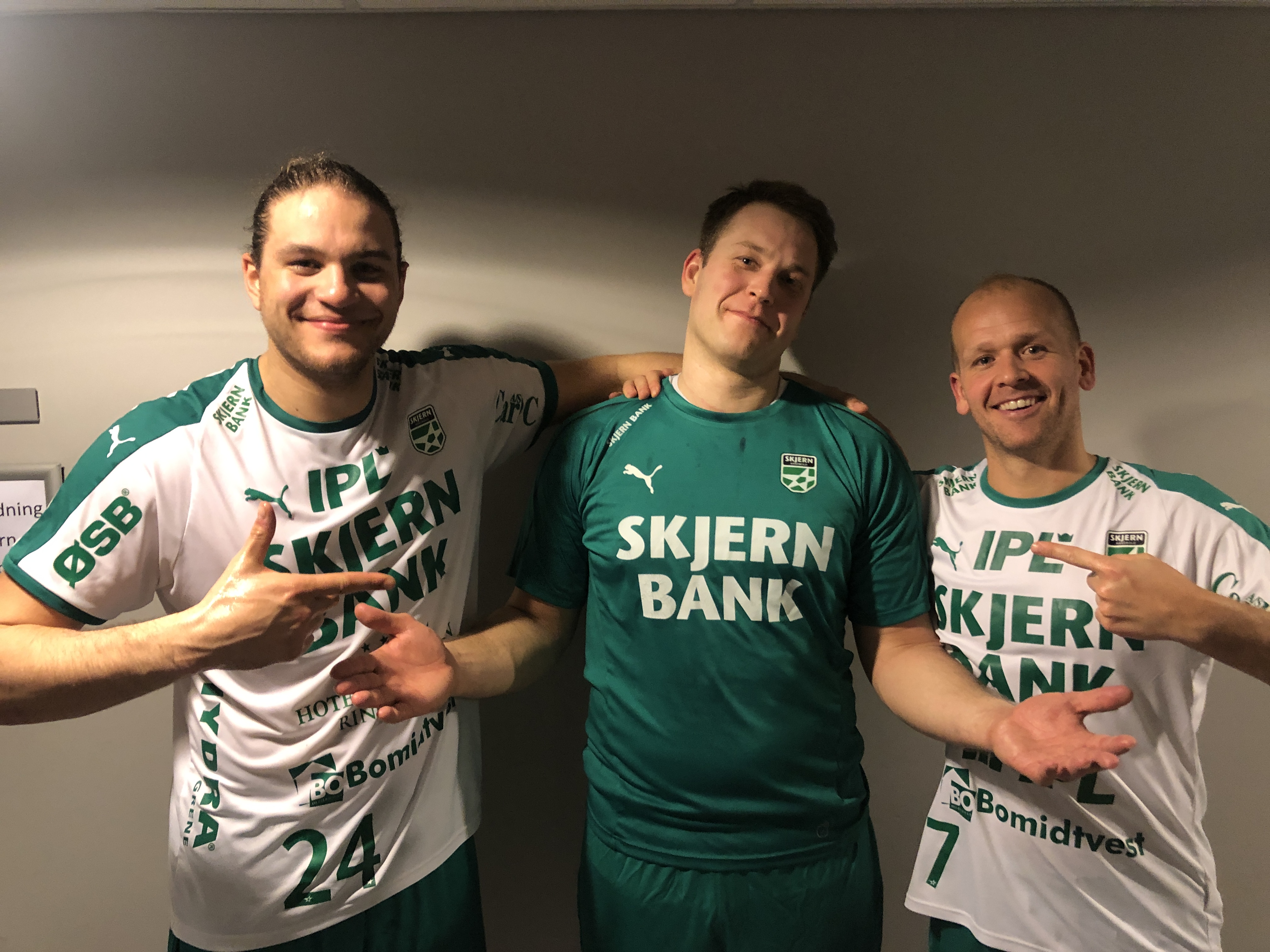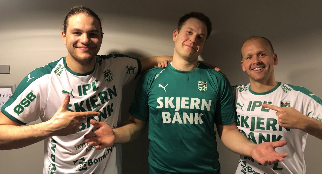 Tre glade og tilfredse Skjern-spillere efter 14-målssejren.