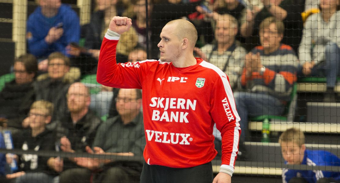 Søren Pedersen stod en flot kamp i Skjern-målet og sluttede kampen af med en redningsprocent på 41. Foto: Steffen Bloch