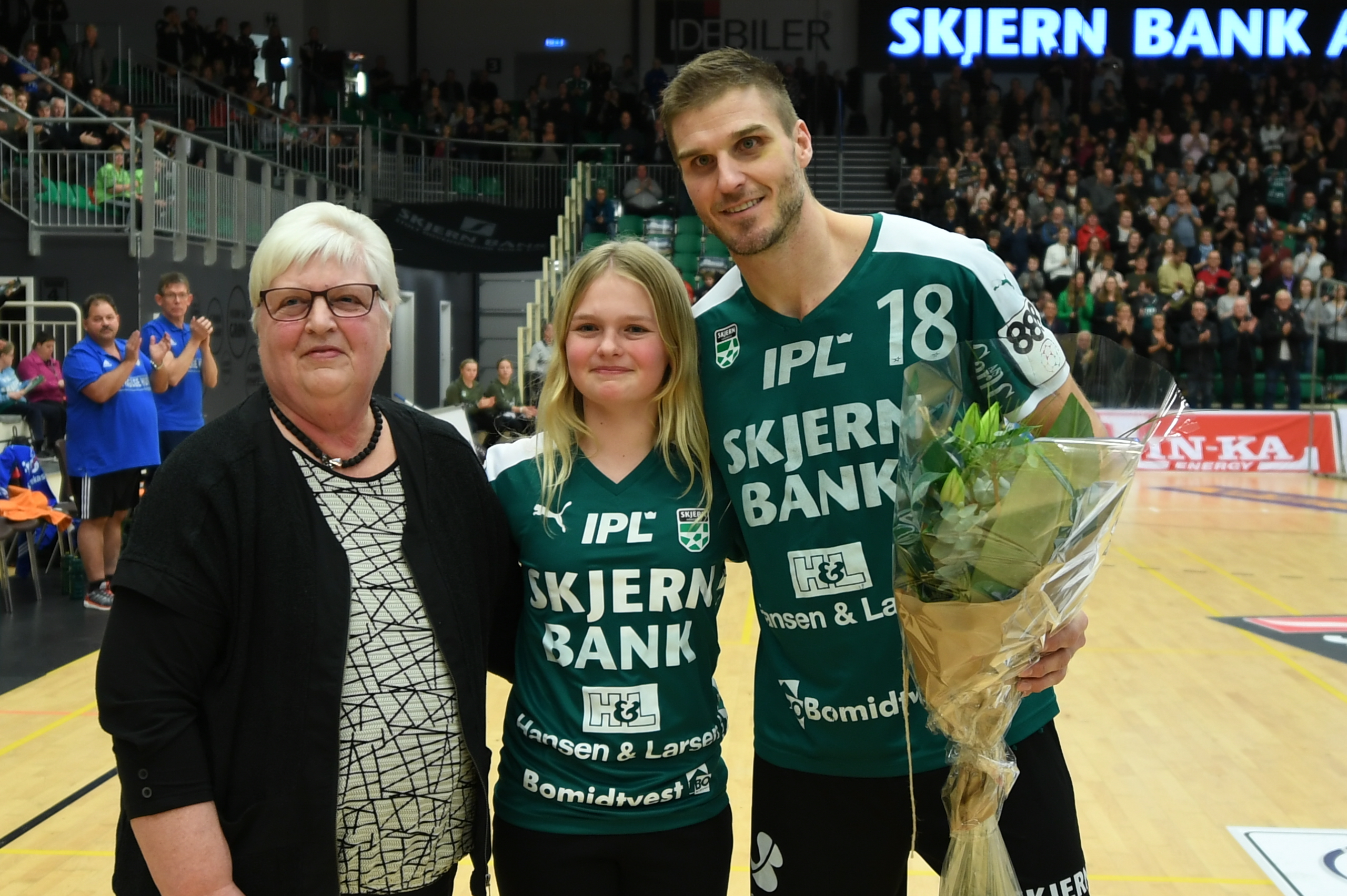 Meta Larsen og Laura Meldgaard overrakte blomster til Skjern-anføreren på vegne af Hansen & Larsen.