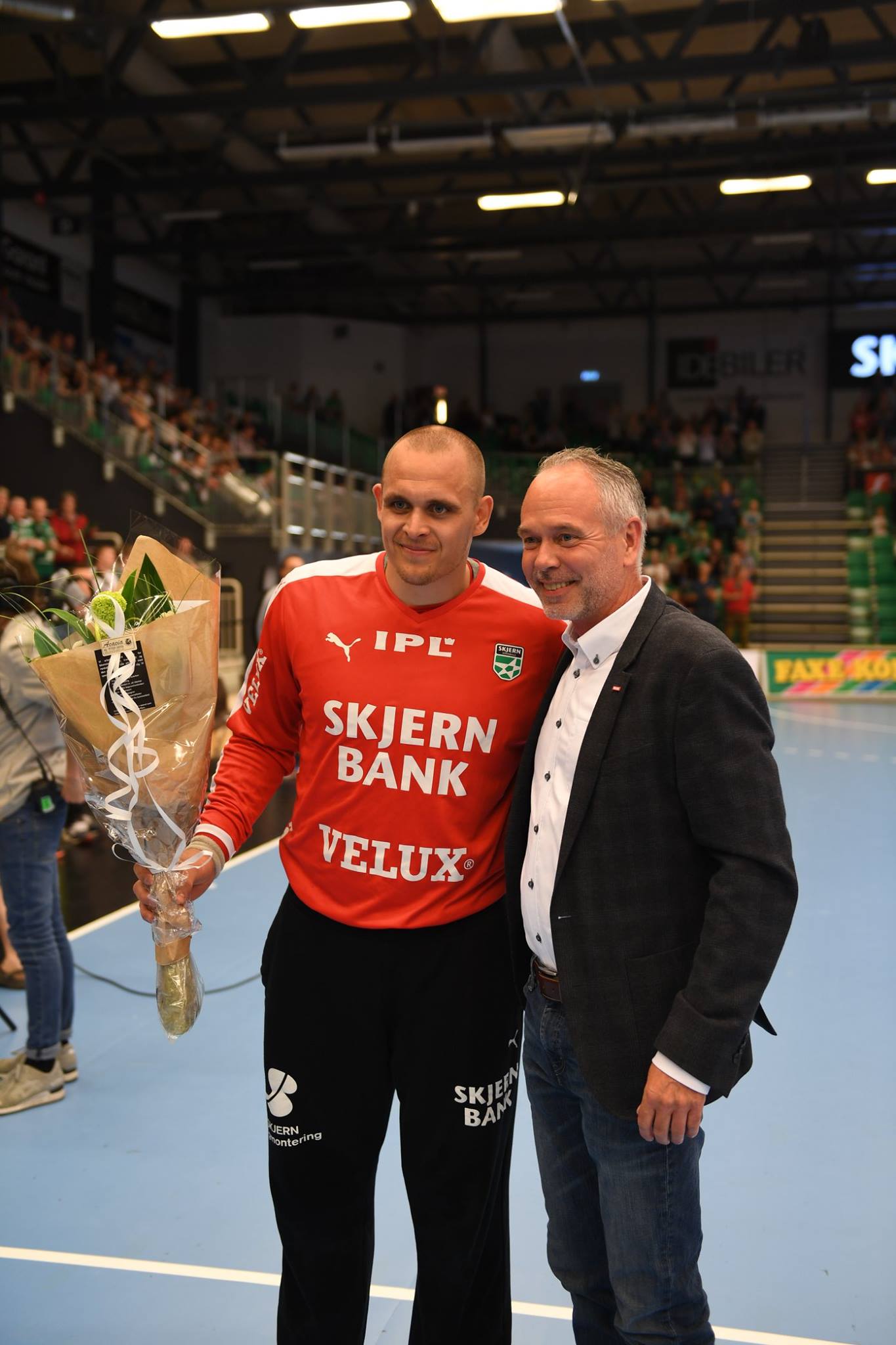 Før lørdagens kamp fik Søren Pedersen overrakt blomster af Finn Olesen fra Velux.