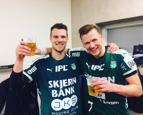 To Skjern-spillere på rundens hold