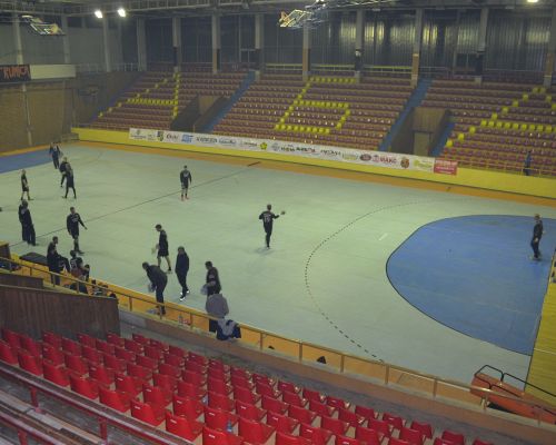 30-40 makedonske tilhængere bød Skjern-spillerne velkommen til aftentræningen med pift, sang og buh-råb.